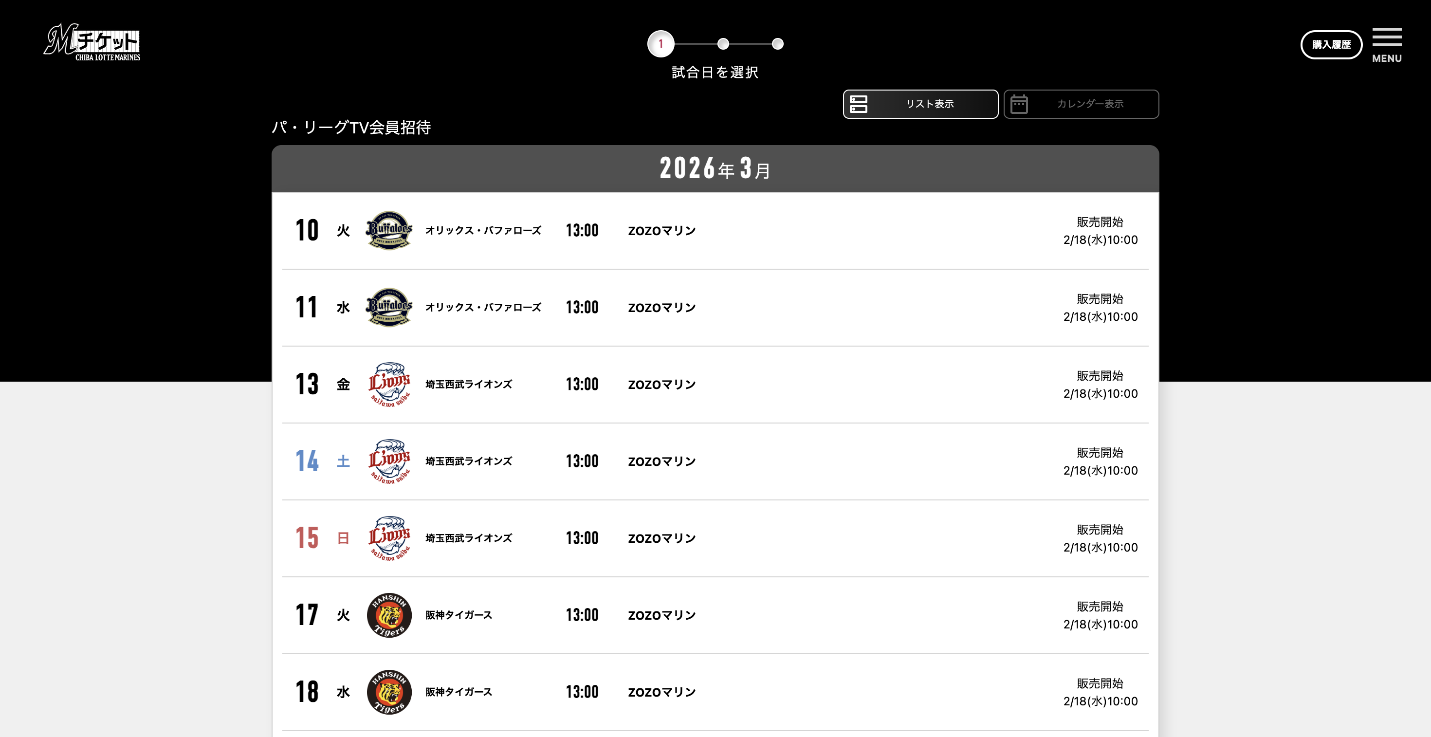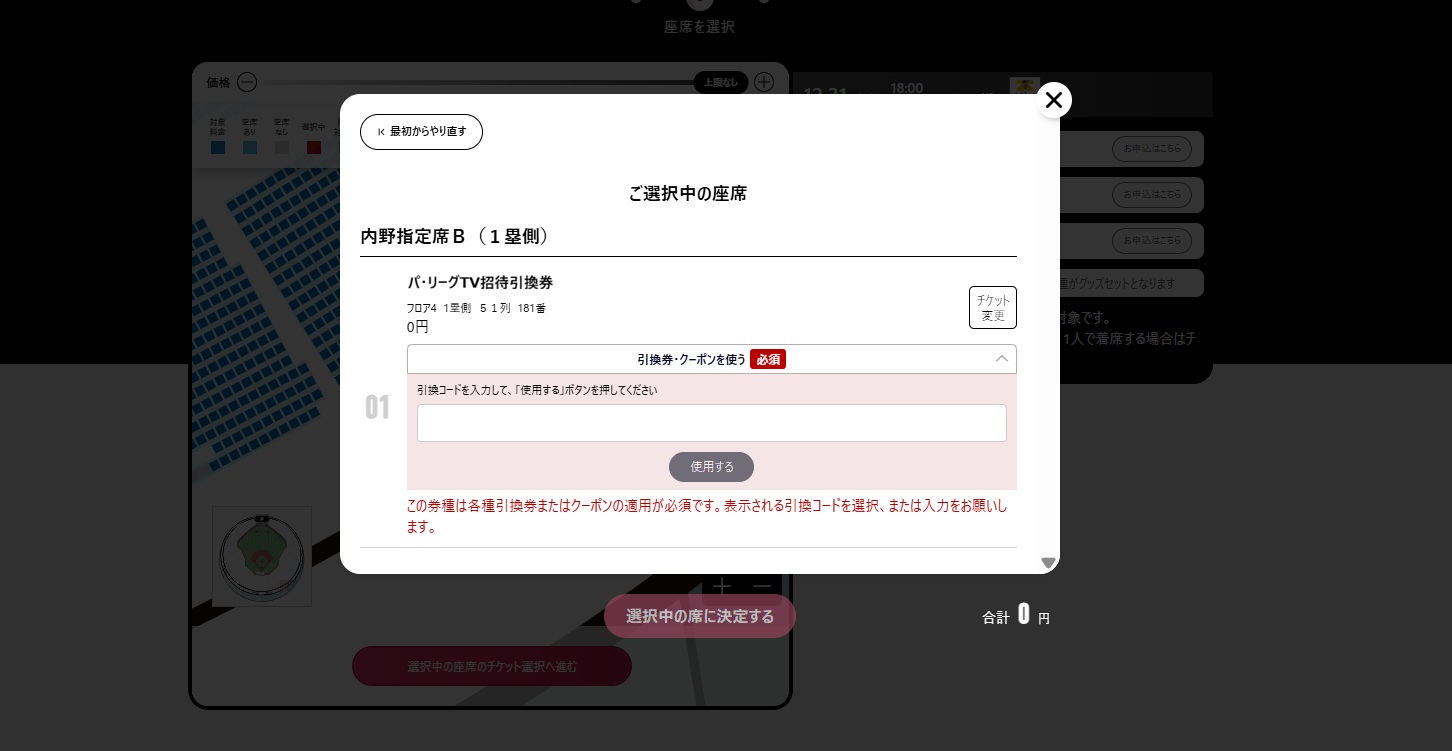 座席選択後に「パ・リーグTV引換券」を、最大2枚まで選択ください。