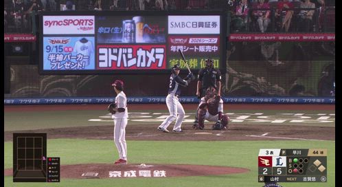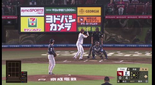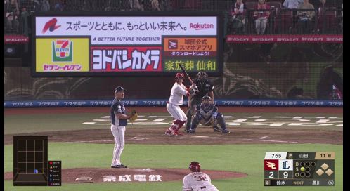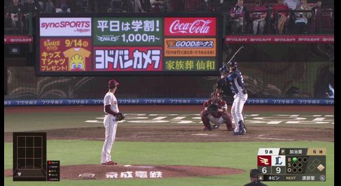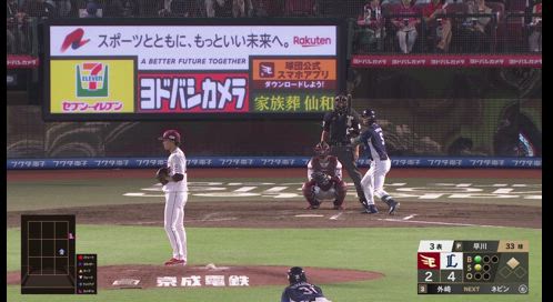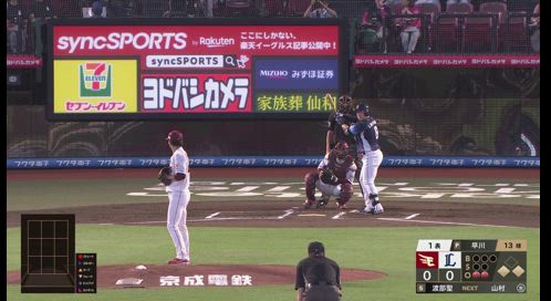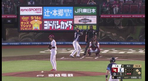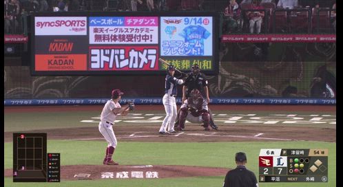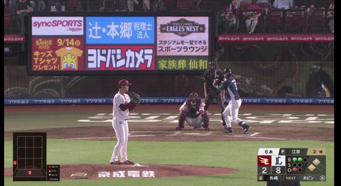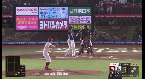 守備変更:中島→ライト 守備変更:鈴木大→ファースト 守備変更:堀内→キャッチャー 守備変更:村林→サード 守備変更:ゴンザレス→レフト 守備変更:則本→ピッチャー