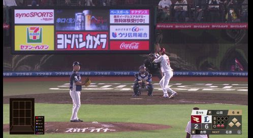 守備変更:黒川→セカンド 守備変更:伊藤→レフト 守備変更:鈴木大→ファースト 守備変更:日當→ピッチャー