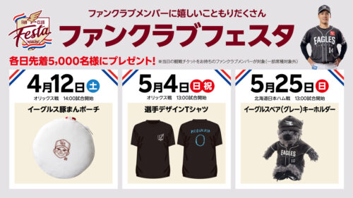 楽天は29日、公式ファンクラブ「CLUB EAGLES」メンバーのためのイベント「ファンクラブフェスタ」を、昨シーズンに引き続き、今季も4月12日(土)・5月4日(日・祝)・5月25日(日)の3試合で開催することになったと発表した。当日は、ファンクラブメンバー限定の来場者プレゼント(各日先着5,000名様)に加え、楽天モバイルパーク宮城内でのグルメ購入時に「ファンクラブユニフォーム2025プレイヤーステッカー」をプレゼント。さらに、ファンクラブの方を対象とした限定イベントの実施やファンクラブフェスタスペシャルチケットの販売を予定している。イベント参加者の募集時期およびチケット販売の詳細は決まり次第発表となる。