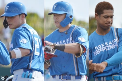 楽天との練習試合にスタメン出場した3番・清宮幸(左)、4番・野村(中)、5番・万波