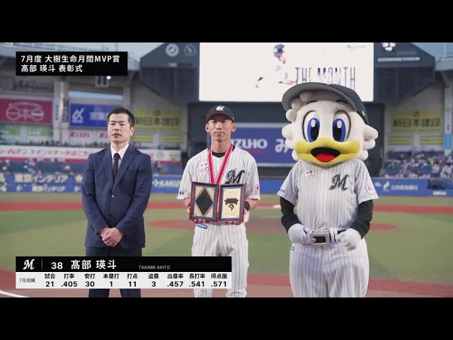 マリーンズ・高部瑛斗 7月度「大樹生命月間MVP賞」表彰式!! 2024年8月21日 千葉ロッテマリーンズ 対 北海道日本ハムファイターズ