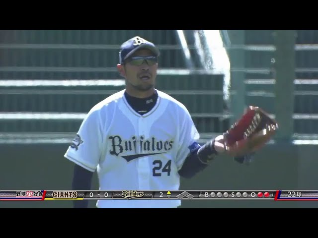 【2回表】バファローズ・宮﨑 フェンスギリギリの打球をフェンス間際でナイスキャッチ!! 2018/3/10 Bs-G
