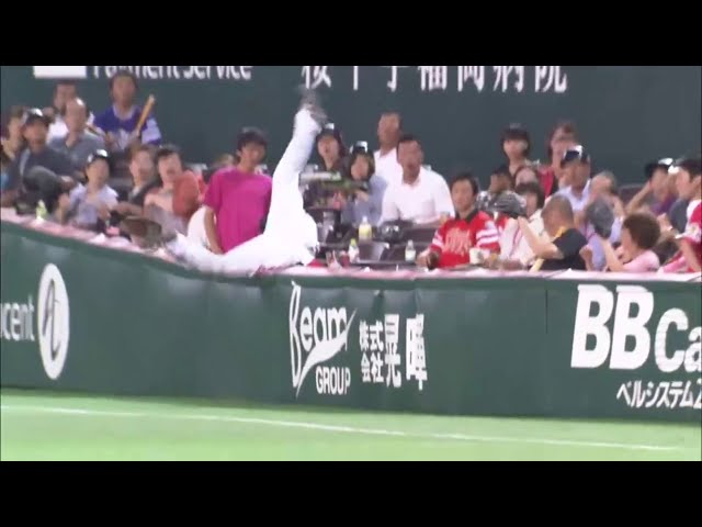4回表 ホークス長谷川が観客席に飛び込みナイスキャッチ!! 見事なプレーに鷹ファンも大興奮!! 2014/7/4 H-E