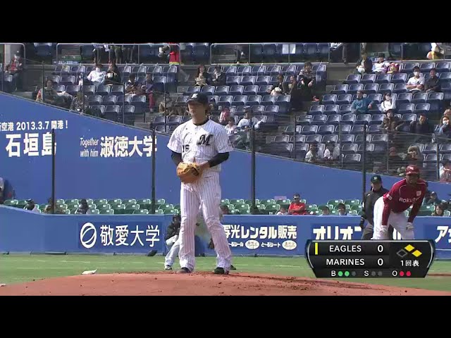 マリーンズ涌井 風速14メートルの強風にも集中力を切らさず、二死1・2塁のピンチ切り抜ける!! 2014/3/18 M-E