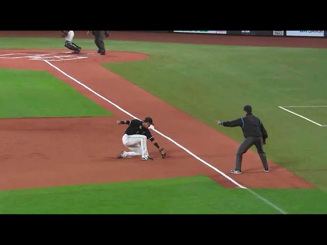 【1回裏】マリーンズ・安田尚憲 三塁線を抜けそうな当たりを逆シングルでさばく!! 2023年4月20日 北海道日本ハムファイターズ 対 千葉ロッテマリーンズ
